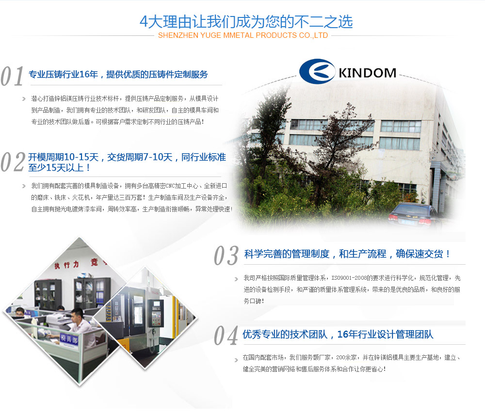 公司坐落在美麗的觀潮勝地海寧連行經(jīng)濟開發(fā)區(qū)內(nèi),距杭州18公里,緊靠杭州繞城高速(G2501)下沙出口,距江東汽車產(chǎn)業(yè)園10公里。公司占地面積33000平方米,廠房建筑面積15050平方米。擁有各種高低噸位的著名品牌壓鑄件15臺(其中800T壓鑄機2臺、500T壓鑄機2臺、280T壓鑄機5臺、135T壓鑄機6臺),還有高精密自動沖床、高精密度多軸鉆床、切邊機、表面處理等設(shè)備20余臺。公司擁有三坐標測量儀、光譜分析儀、硬度拉力試驗機等精密計量檢測設(shè)備。